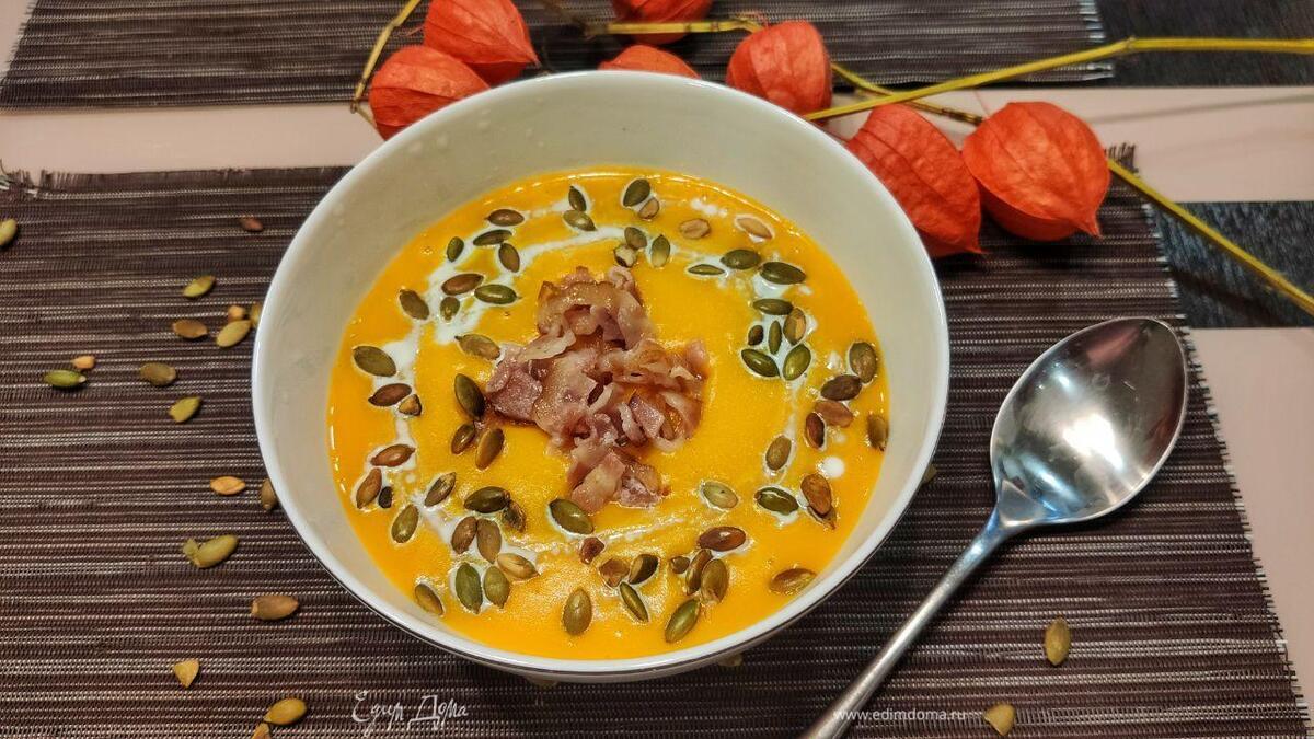 Тыквенный крем-суп с беконом и семечками